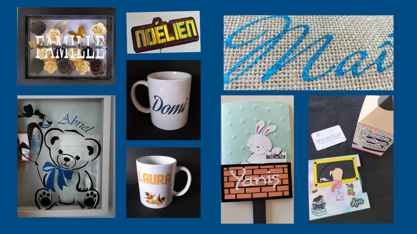 Vous souhaitez apporter une touche unique à vos articles ? C’est tout à fait réalisable ! Que ce soit un prénom, un nom ou un surnom, sur divers objets tels qu'un mug, un sac, un tableau, une carte...
